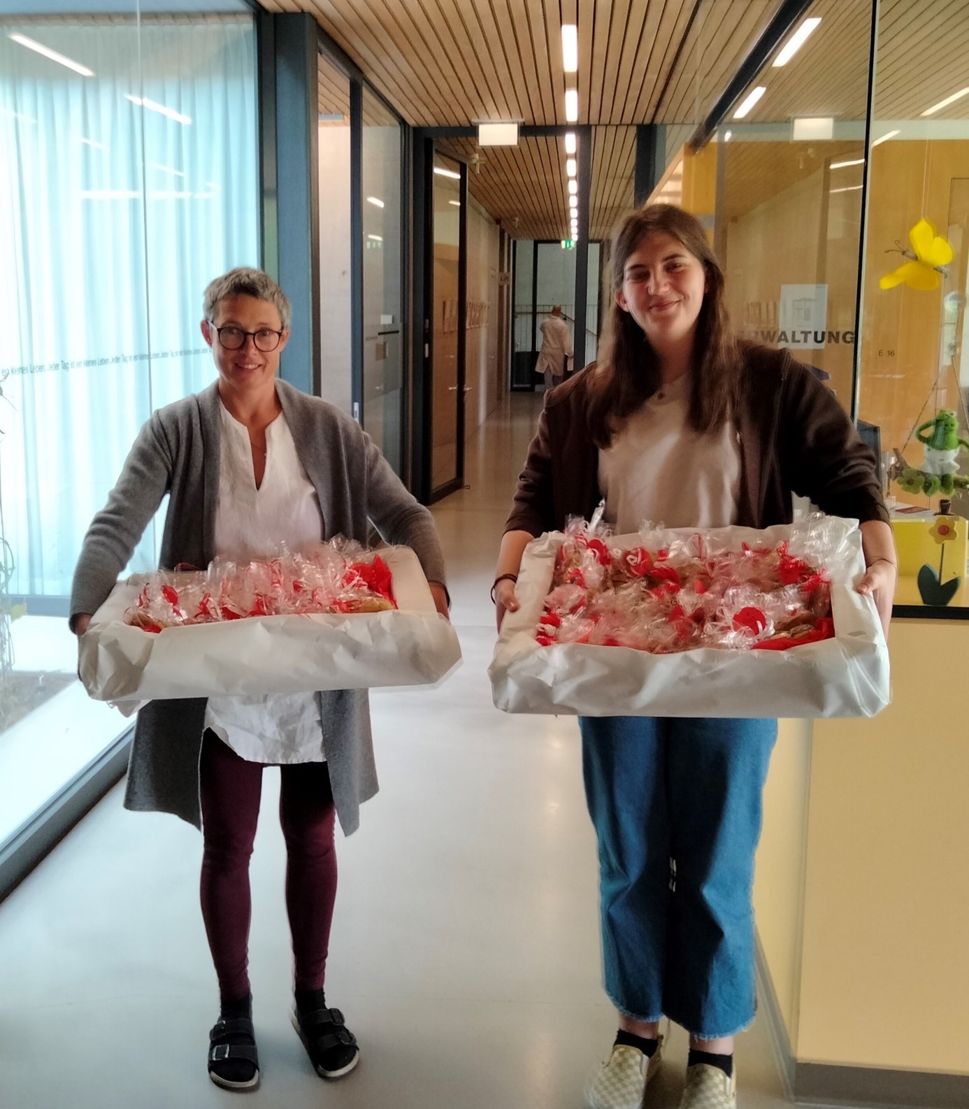 ... mit den Kindern des Kindergarten Haselstauden, die sich seit Februar nun nicht mehr mit uns das Gebäude teilen, sondern in der Ausweichschule in Fischbach Quartier gefunden haben. Die Schüler:innen der EWF hatten Freude die kleinen Bäcker:innen beim Häschen machen zu unterstützen.